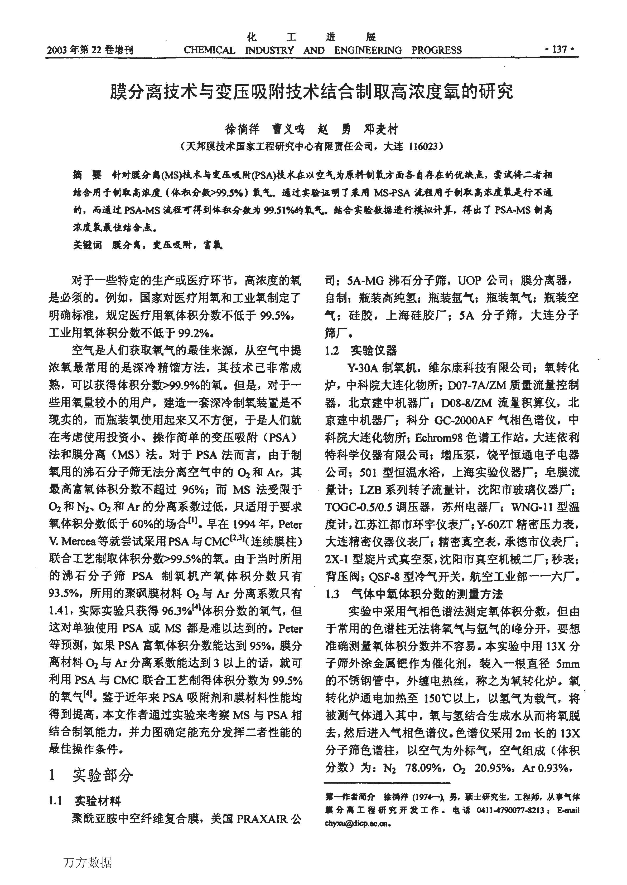 膜分離技術(shù)與變壓吸附技術(shù)結(jié)合制取高濃度氧的研究