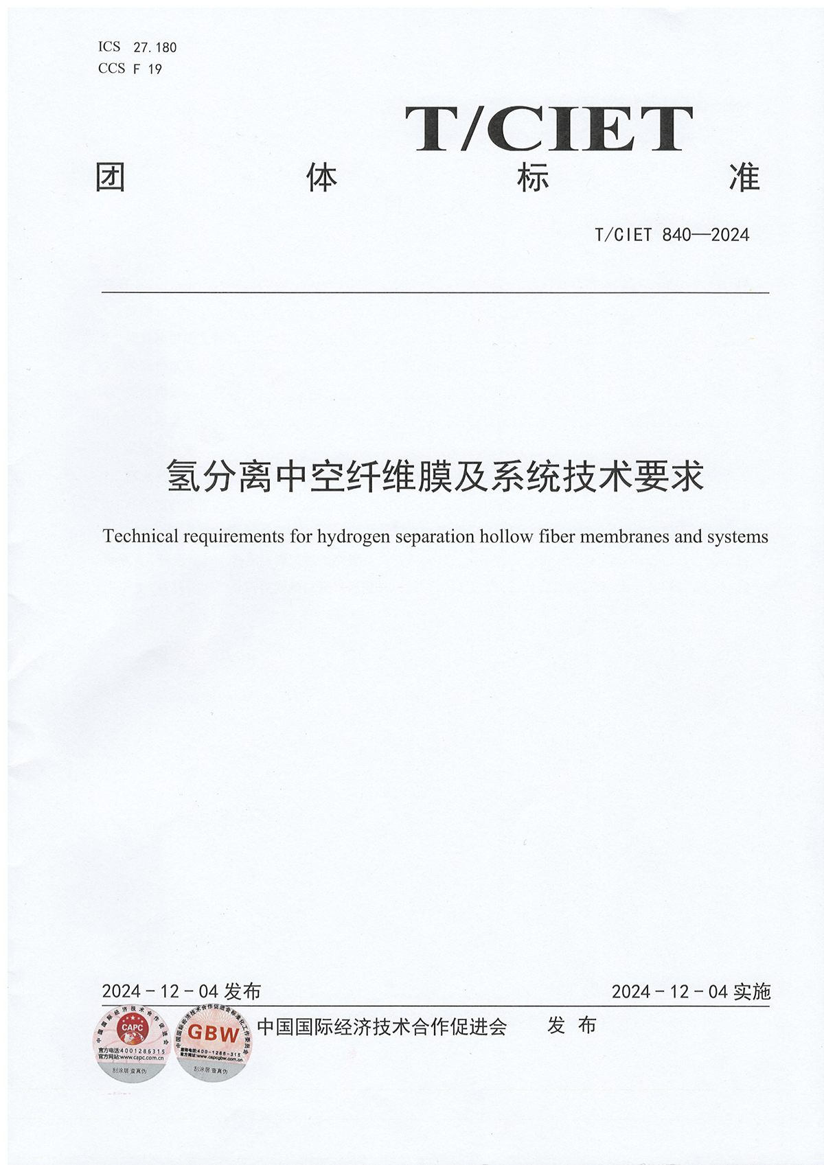 2024年12月4日,天邦公司與大連理工大學等共9家單位共同發(fā)布了《氫分離中空纖維膜及系統(tǒng)技術要求》團體標準。