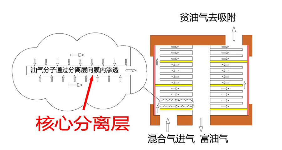 核心分離層采用硅橡膠復(fù)合膜技術(shù)(專利號:ZL 2015 1 0856947.7),硅橡膠功能層(膜分離器核心)與支撐基層結(jié)合成膜后具有超薄(裝填密度大)、牢固(壽命長)及無缺陷(分離性能高)的優(yōu)點。在此基礎(chǔ)上制作加工的疊式膜分離器,應(yīng)用在有機(jī)蒸汽(VOCs)分離過程中,能很好的滿足其處理量大、分離系數(shù)高以及氣體組分復(fù)雜工況下的長壽命工藝要求,目前是國內(nèi)VOCs治理領(lǐng)域內(nèi)不可替代的、唯一能替代進(jìn)口的膜分離器產(chǎn)品。