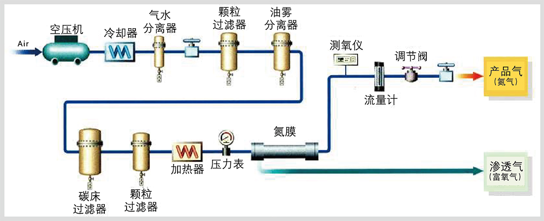 空氣中的氮?dú)夂脱鯕庠谀蓚?cè)壓力差的作用下,由于它們?cè)谀ぶ械娜芙舛群蛿U(kuò)散系數(shù)的不同,導(dǎo)致滲透速率較快的水蒸氣、氧氣等氣體優(yōu)先透過膜,成為富氧氣體;而滲透速率較慢的氮?dú)庠跍魝?cè)富集,成為干燥的富氮?dú)怏w。